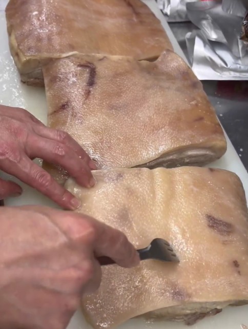 なぜお肉をフォークで刺すのかと 潘料理長に聞いてみたら、 まず味がしっかり染み込みやすくなる 後は余計な脂を落とせる。